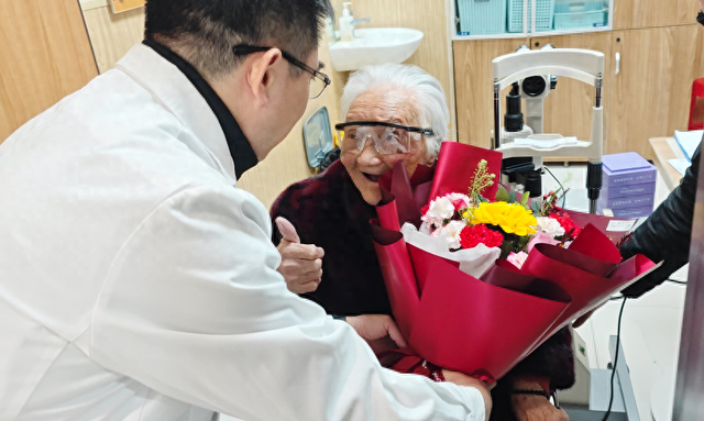 泉州爱尔眼科医院院长吴松一(左)为林阿婆送上鲜花与新春祝福,阿婆开心地竖起大拇指